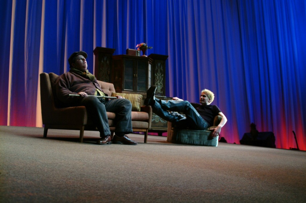 Early on in the production process, I had a dream in which we were performing the play on a steep rake, as if it were a Molière comedy — I approached Mark with the idea, and he was not only excited, but managed to build the rake first, so we could build the show and the characters around it.